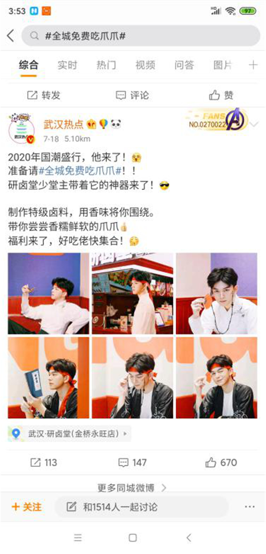 从微博数据可见,微博话题的整体阅读量近6千万,#全城免费吃爪爪#等话题被许多KOL引用,也晒出了自己的靓照;而微信、抖音等平台中,当下美食大拿如武汉吃货、武汉吃饭公司、精选武汉、娘娘开饭啦……超多大V们的信息发布积累起新的热度,截止周年庆活动结束,已有近10个平台为研卤堂助力。