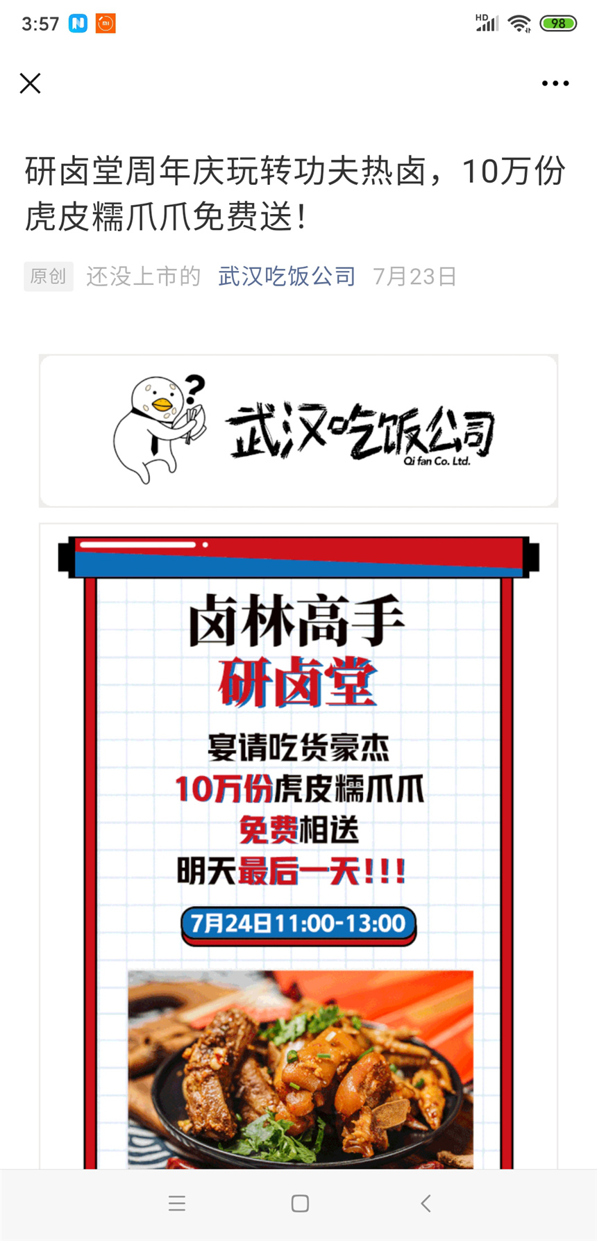 2020年7月,恰逢周年庆,研卤堂围绕招牌虎皮糯爪爪做文章。通过自媒体等多个渠道发放10万份虎皮糯爪爪免费券,真正回馈消费者,20余家研卤堂门店共同参与,实现了一次全国范围内的大联动。